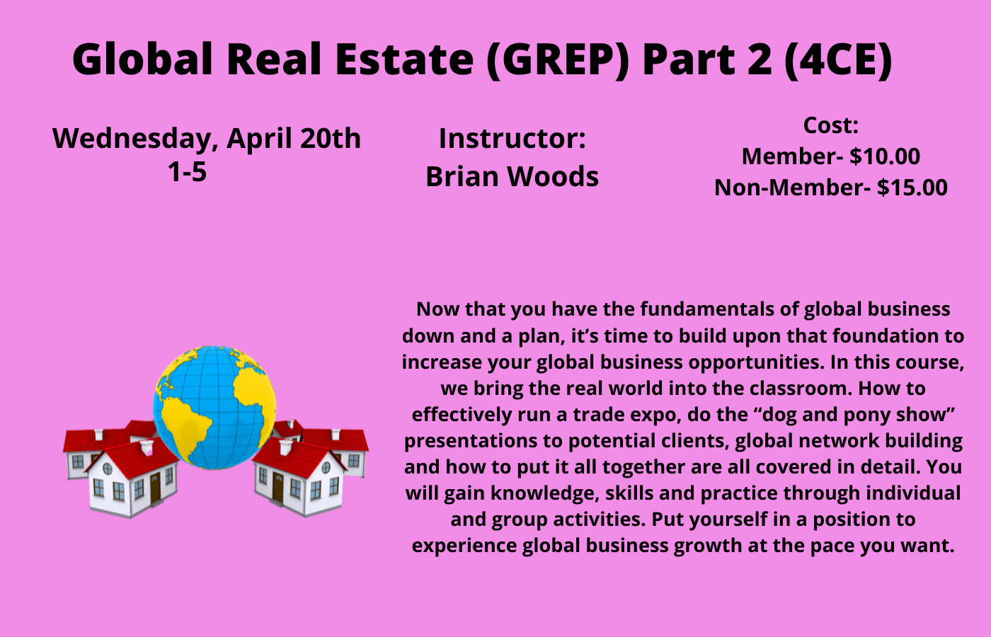 Now that you have the fundamentals of global business down and a plan, it’s time to build upon that foundation to increase your global business opportunities. In this course, we bring the real world into the classroom. How to effectively run a trade expo, do the “dog and pony show” presentations to potential clients, global network building and how to put it all together are all covered in detail. You will gain knowledge, skills and practice through individual and group activities. Put yourself in a position to experience global business growth at the pace you want.