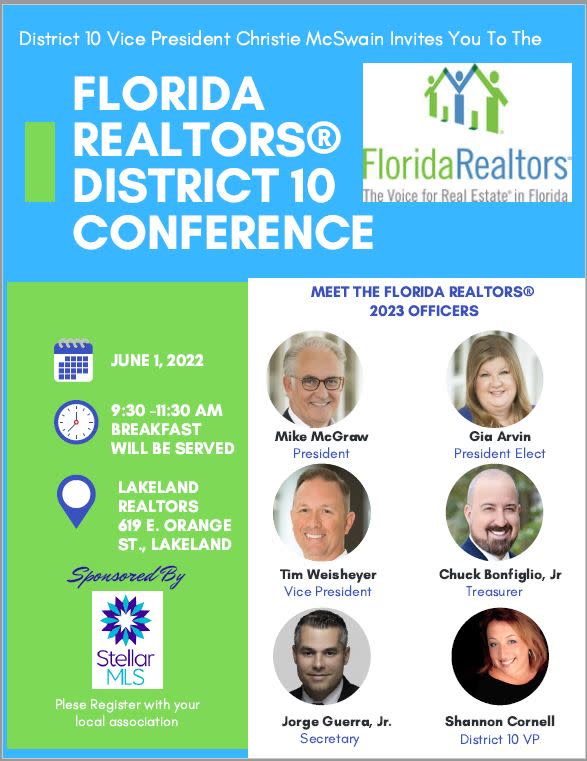 Florida Realtors District conferences are held annually, and are individually hosted by Florida Realtors' 13 district vice presidents. This year, the District 10 meeting will be held at the Lakeland Association of Realtors building.