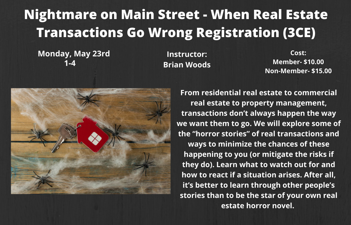 From residential real estate to commercial real estate to property management, transactions don’t always happen the way we want them to go. We will explore some of the “horror stories” of real transactions and ways to minimize the chances of these happening to you (or mitigate the risks if they do). Learn what to watch out for and how to react if a situation arises. After all, it’s better to learn through other people’s stories than to be the star of your own real estate horror novel.