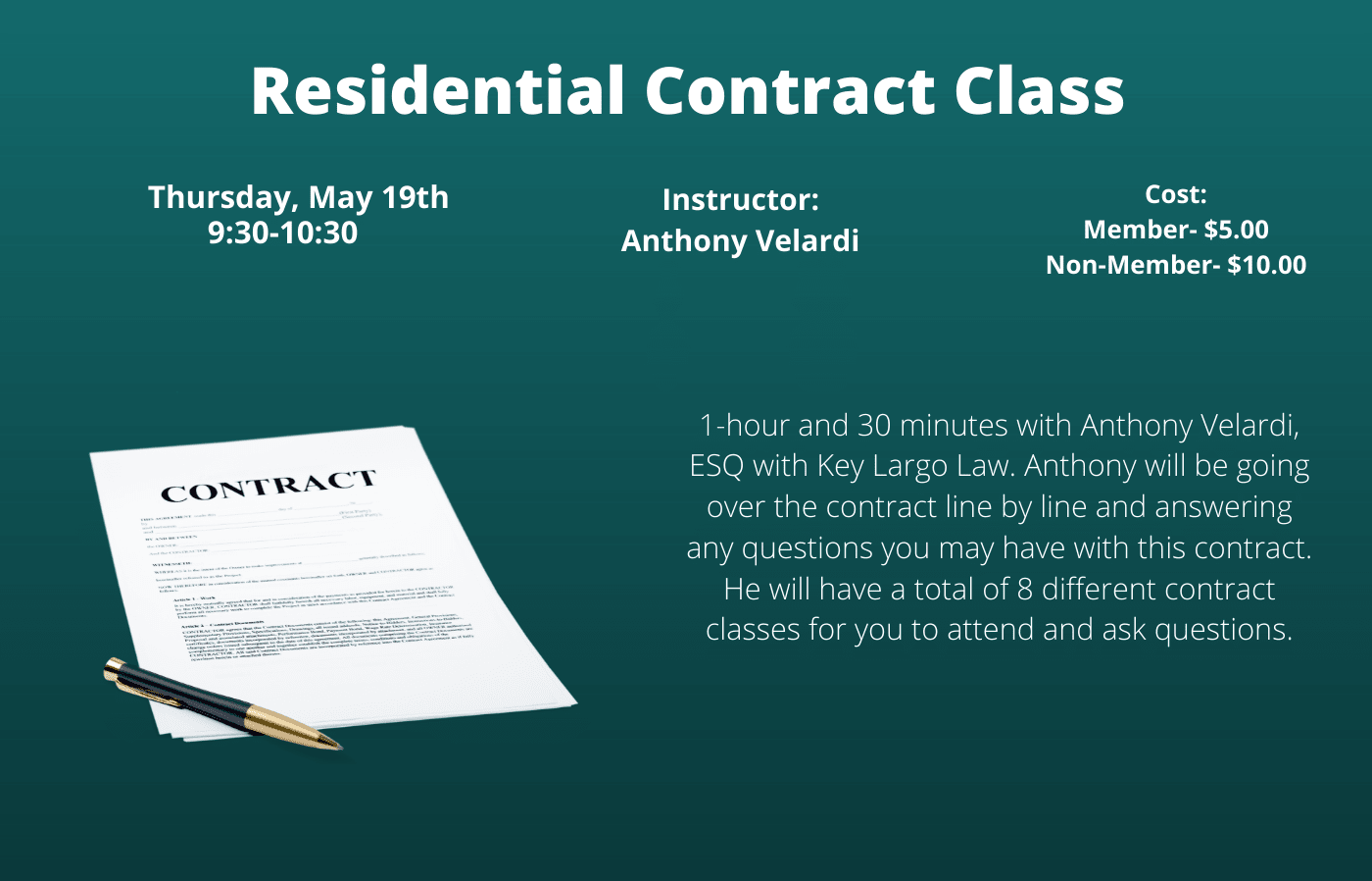 1-hour and 30 minutes with Anthony Velardi, ESQ with Key Largo Law. Anthony will be going over the contract line by line and answering any questions you may have with this contract.