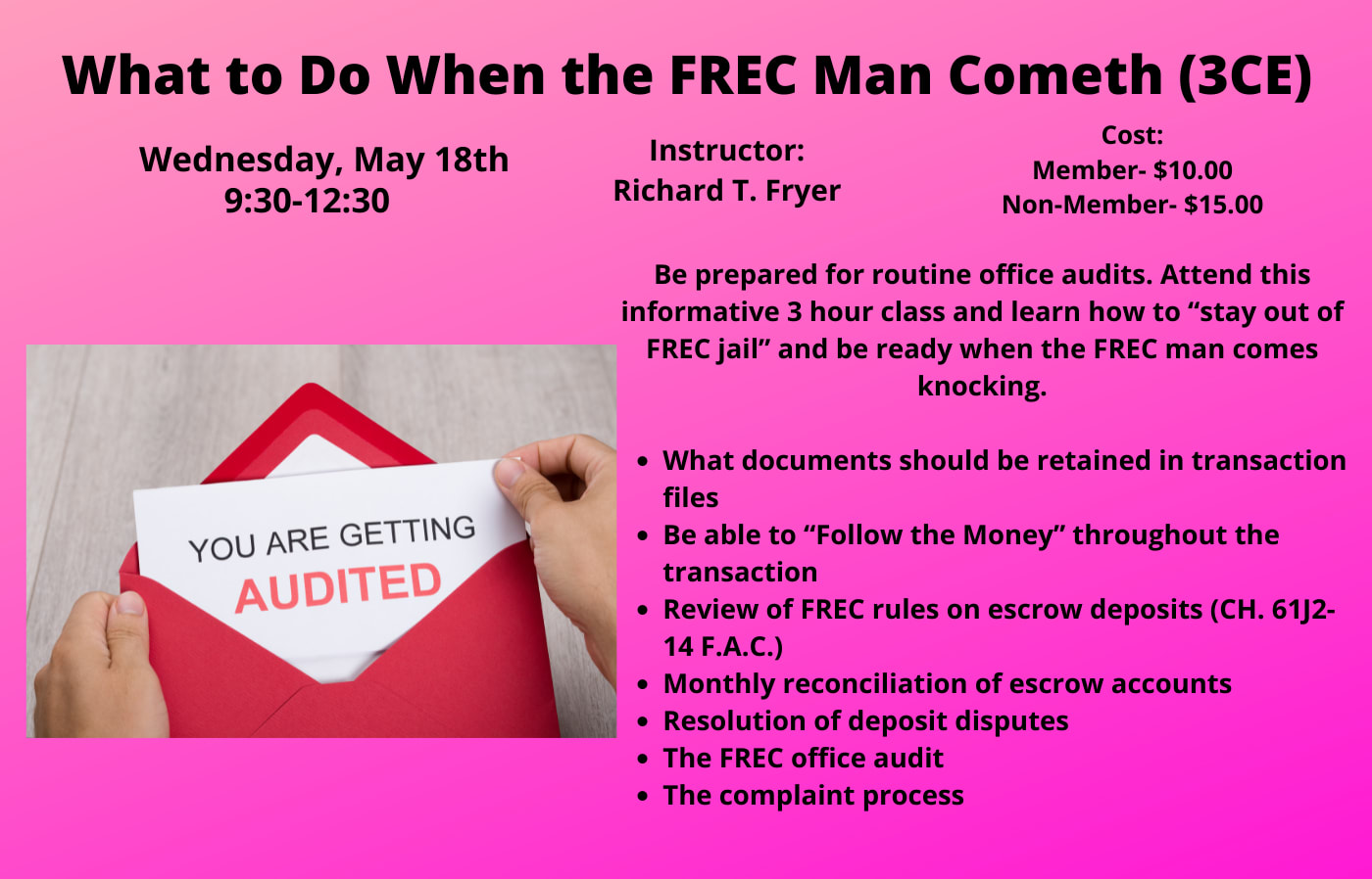 Be prepared for routine office audits. Attend this informative 3 hour class and learn how to “stay out of FREC jail” and be ready when the FREC man comes knocking.